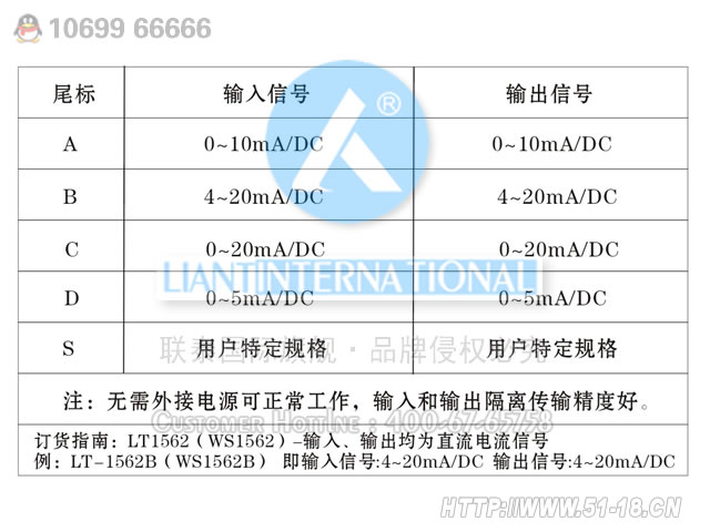 ●输出信号:0~5mA/DC、0~10mA/DC、0~20mA/DC、4~20mA/DC