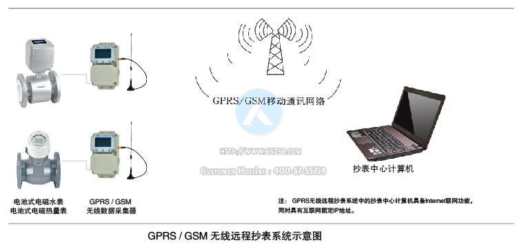 GPRS无线远程抄表系统由:电池水表、GPRS无线数据采集器、GSM移动公网、Internet互联网、具备互联网固定IP地址的抄表中心计算机及中心计算机管理软件组成。