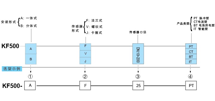 KF500型涡轮流量计为一种速度式计量仪表。用于测量充满封闭管道,连续流动的液体体积流量。涡轮流量传感器适合于测量粘度低的液体,具有精度高、可承受的工作压力大等特点。前置放大器分脉冲输出、4~20mA标准电流信号输出型,流量检测器有普通型、耐磨型和防腐型,其中耐磨型除轴承和轴采用硬质合金外,并设计成对叶轮有适当的反推力,使之更适合于测量汽油等润滑性能较差的液体。