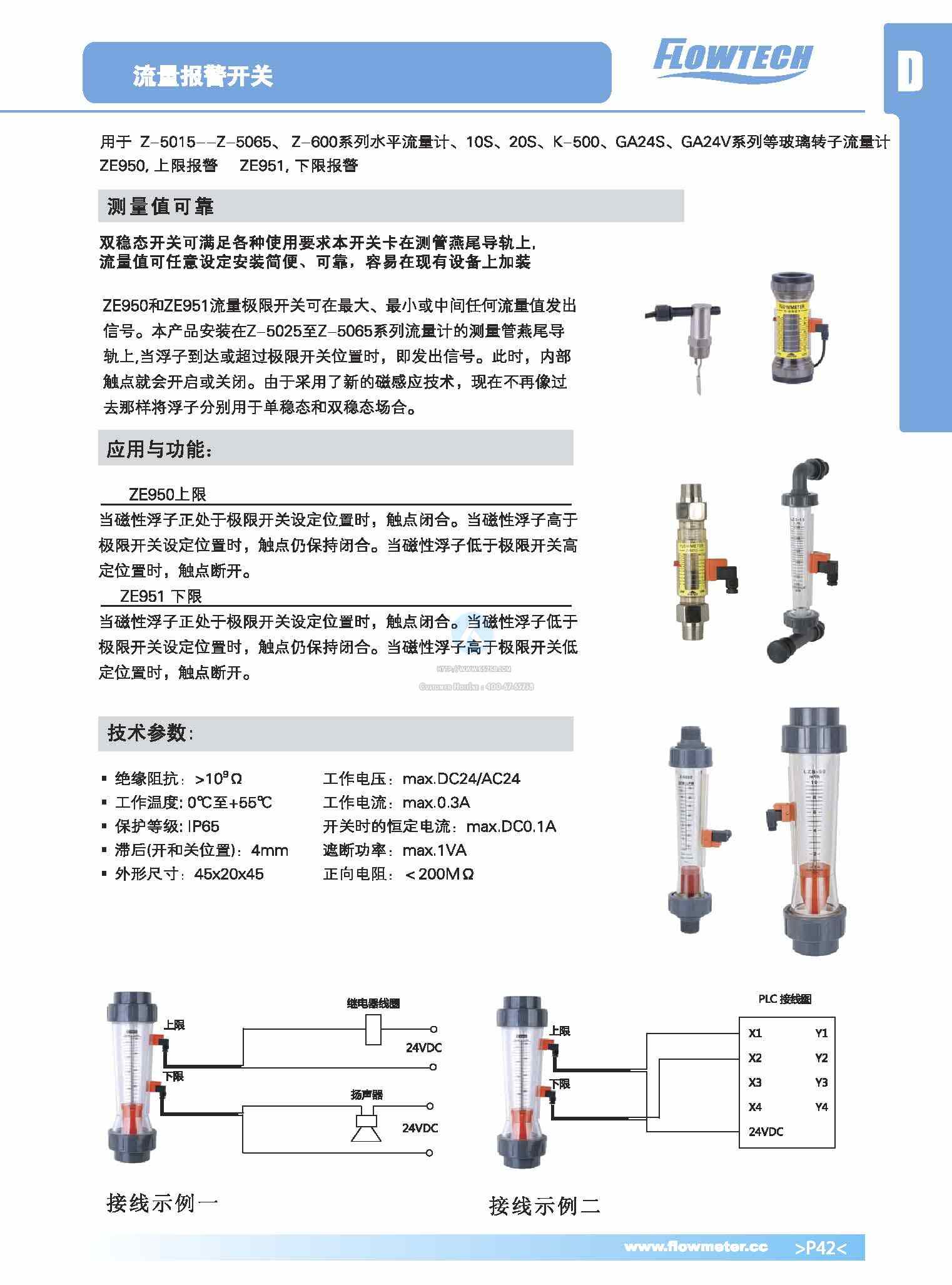 ZE950和ZE951流量极限开关可在最大、最小或中间任何流量值发出信号。本产品安装在Z-5025至Z-5065系列流量计的测量管燕尾导轨 上,当浮子到达或超过极限开关位置时,即发出信号。此时,内部触 点就会开启或关闭。由于采用了新的磁感应技术,现在不再像过去 那样将浮子分别用于单稳态和双稳态场合。