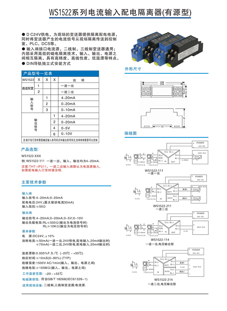 首页> 全部产品 > 变送器> 电流变送器> WS1522电流输入配电隔离器