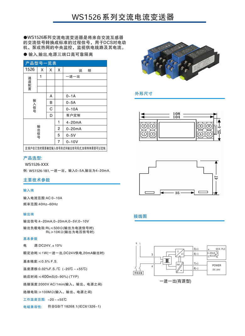 首页> 全部产品 > 变送器> 电流变送器> WS1526交流电流变送器