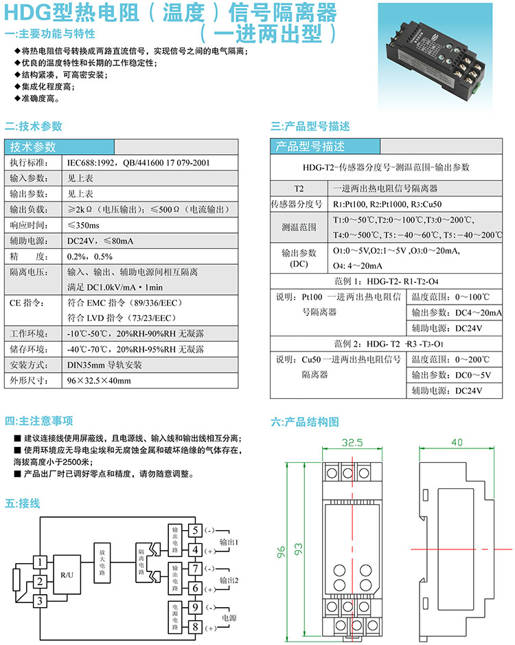 HDG型热电阻(温度)信号隔离器(一进两出型)