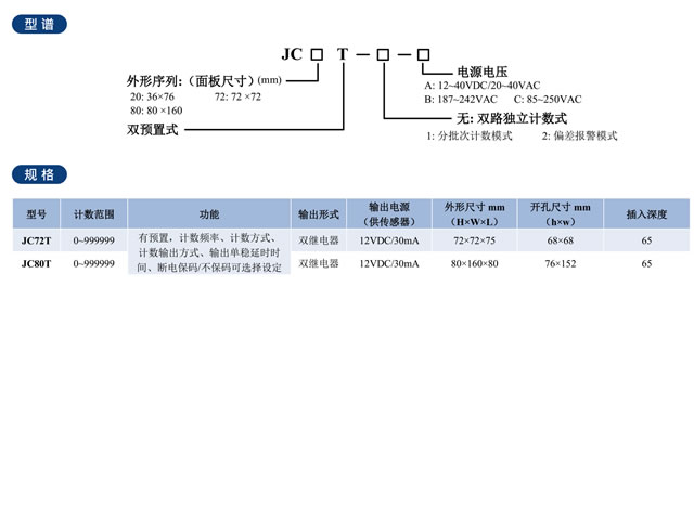 JC-T系列双设定电子计数器是我公司推出的新一代高性能计数器,具有分批计数、偏差报警、双预置三种计数工作模式。该系列采用单片机技术、SMT表面贴装技术、电磁兼容性设计等先进计数与工艺,具有计数准确、计数频率高、停电数据保存永久、加/减计数方式、双路组合控制、多种控制输出、抗干扰性能强、外形美观等优点。