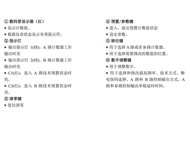 高亮度LED显示,在计数状态按“ ◀ ”键可选择显示A路计数器值(C1指示灯亮)或B路计数器值(C2指示灯亮),默认则显示A路计数器值。A路计数器控制输出1,B路计数器控制输出2