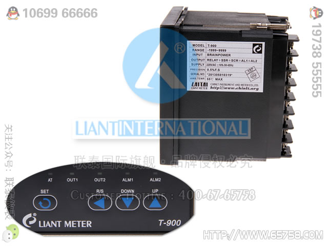 ●选型说明:T系列智能显示调节仪均为多量程输入型,用户只需通过仪表内部的菜单设置即可改变仪表的输入信号类型,而仪表的主控制调节输出,除T-100因接线端子不够,输出不能通用外,其余外形尺寸的仪表,其继电器接点信号输出(RELAY),固态继电器驱动电压输出(SSR)可控硅过零触发调节(SCR)等均已在一块仪表上同时实现,用户只需改变相应的接线位置即可,极大地方便了用户的选择。而仪表的报警信号输出,同一个接点,在改变内部菜单后,可以有多达8种报警控制方式供用户根据需要选择设置。事实上,用户只需告知所需仪表的外形尺寸,所购买的T系列仪表基本就能满足实际需求,对于用户的特殊用法或特殊功能,可另作说明,由LIANT METER公司在产品出厂前安装设置好。注:本公司出品标准配置如下:①.T-100为全输入,输出RELAY、SCR、 AL1 ②.T-400 T-500 T-600 T-700 T-800 T-900为全输入,输出RELAY、SSR、SCR、AL1、AL2 ③.仪表出厂时输入信号默认为分度号PT100型或K型。
